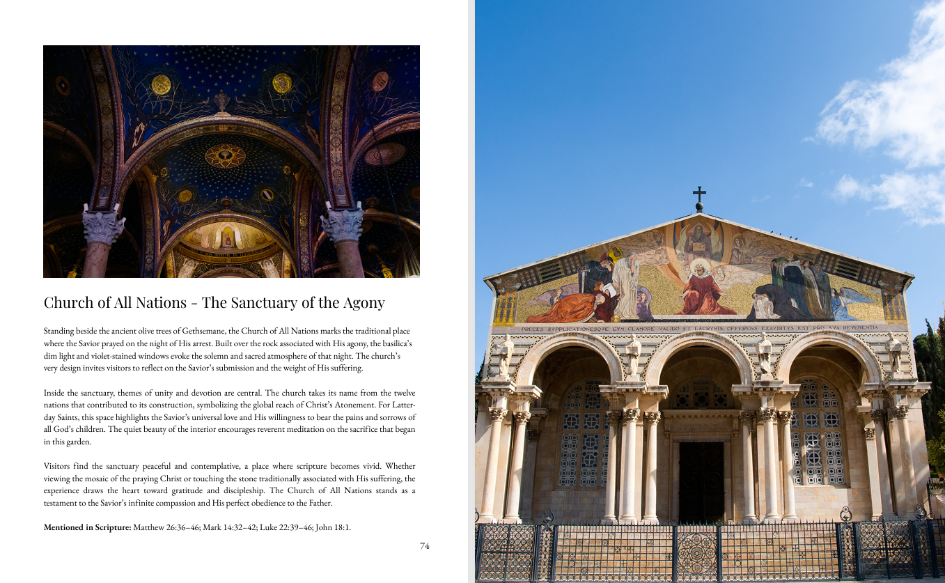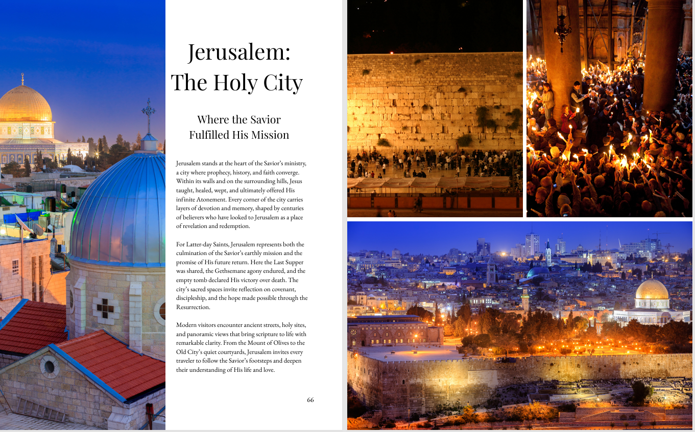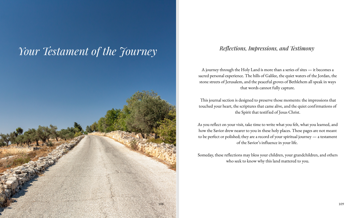 Walking With the Savior is a uniquely crafted Holy Land devotional designed for Latter-day Saints. It blends scripture, historical context, and spiritual insight with stunning photography from Jerusalem, Galilee, Bethlehem, and beyond. Each chapter brings you to a real location in the Savior’s ministry and invites you to reflect, record impressions, and strengthen your personal testimony of Jesus Christ.